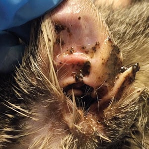 Notez que les isoxazolines (fluralaner, lotilaner, afoxolaner, sarolaner) en spot-on doivent avoir un effet acaricide sur O. cynotis, mais que la plupart n’ont pas d’AMM sur cette indication.