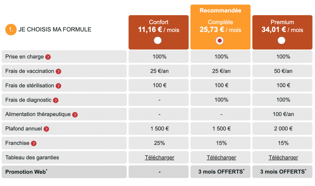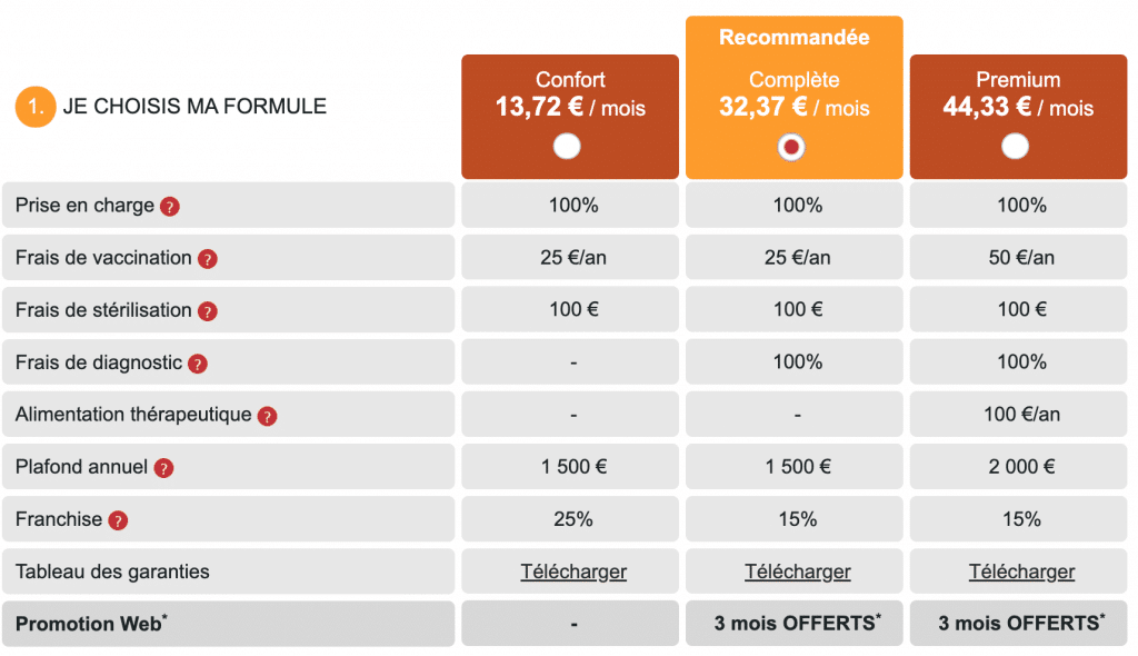 Maintenant abordons, le prix des formules avec une simulation de tarif pour un chien et un chat d’environ 5 ans (au 20 mai 2024).