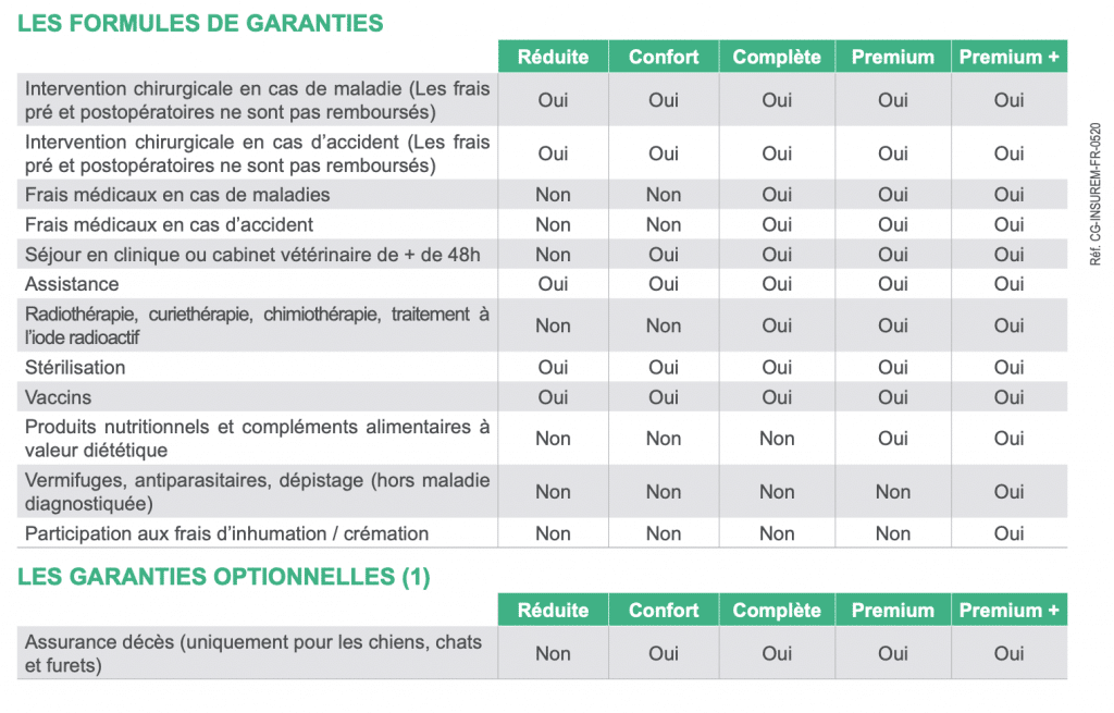 - La formule Premium : chien 44,33 €/mois et une franchise de 15% et plafond de 2000 € et pour un chat 34,01 €/mois et une franchise de 15% et plafond de 2000 €