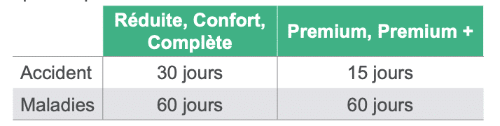 Délais de carence : Le délai de carence dépend de la formule choisie. Par exemple, pour la formule complète, pour les accidents elle est à 30 jours et dans le cas de maladies 60 jours.